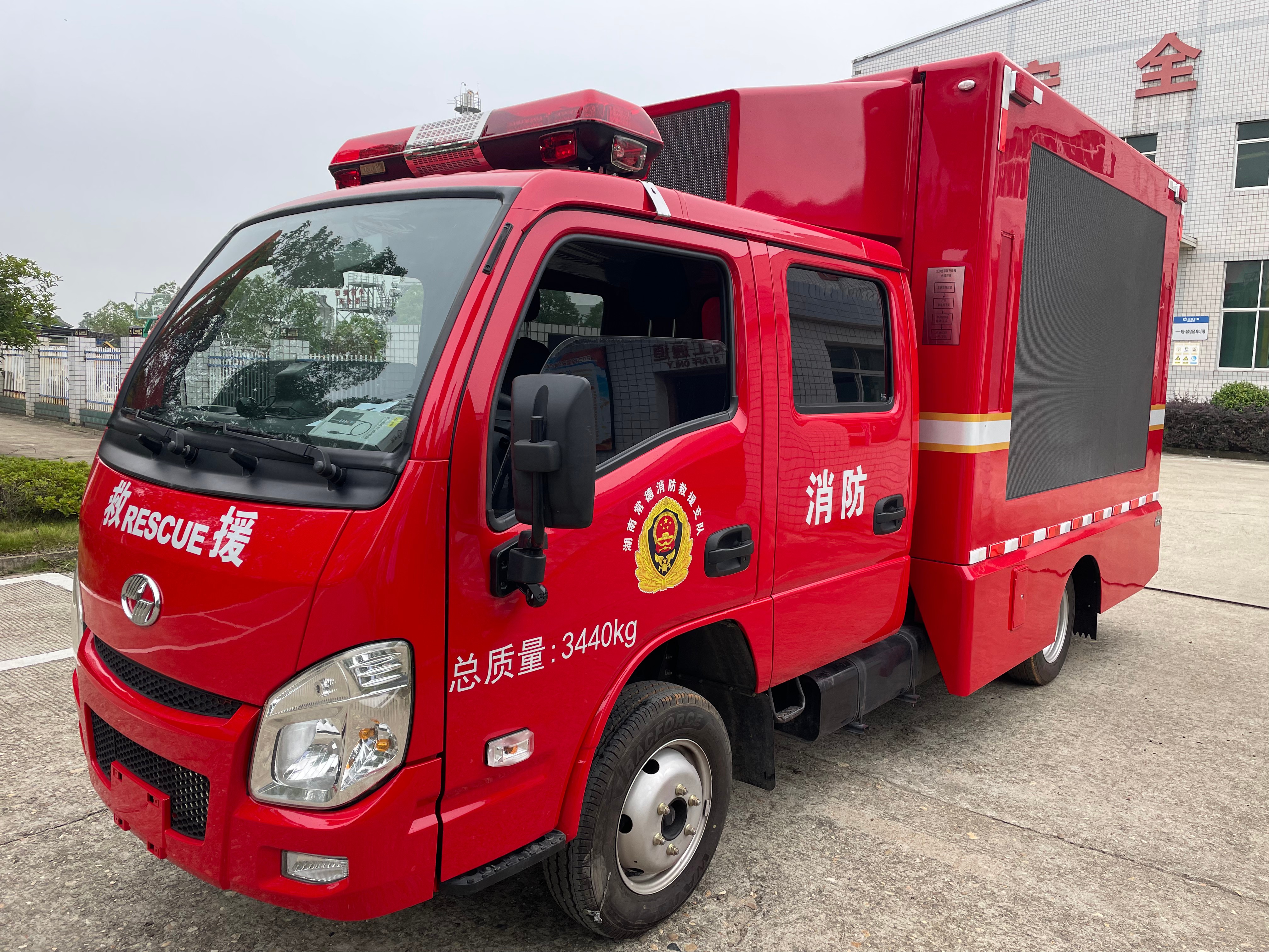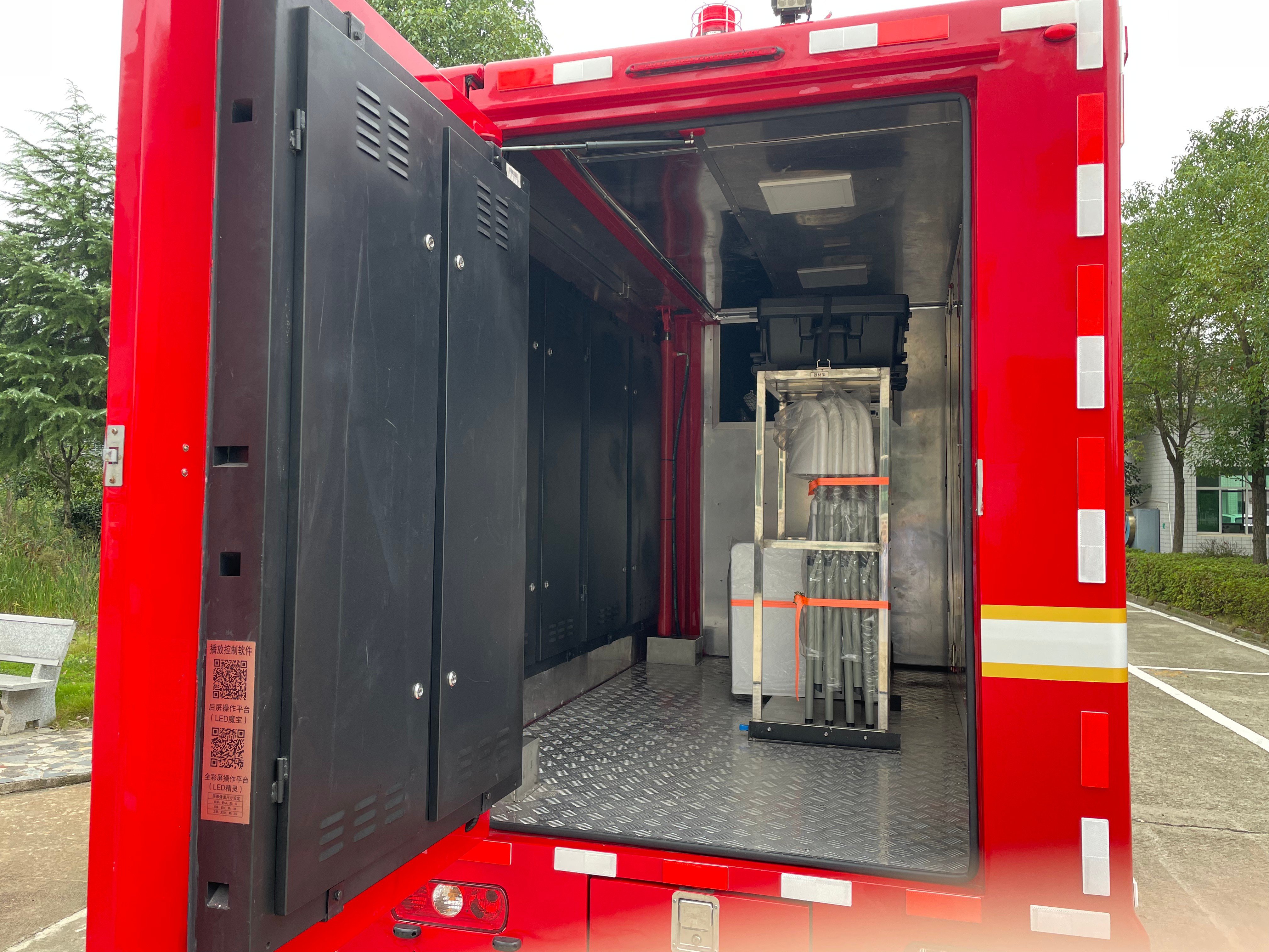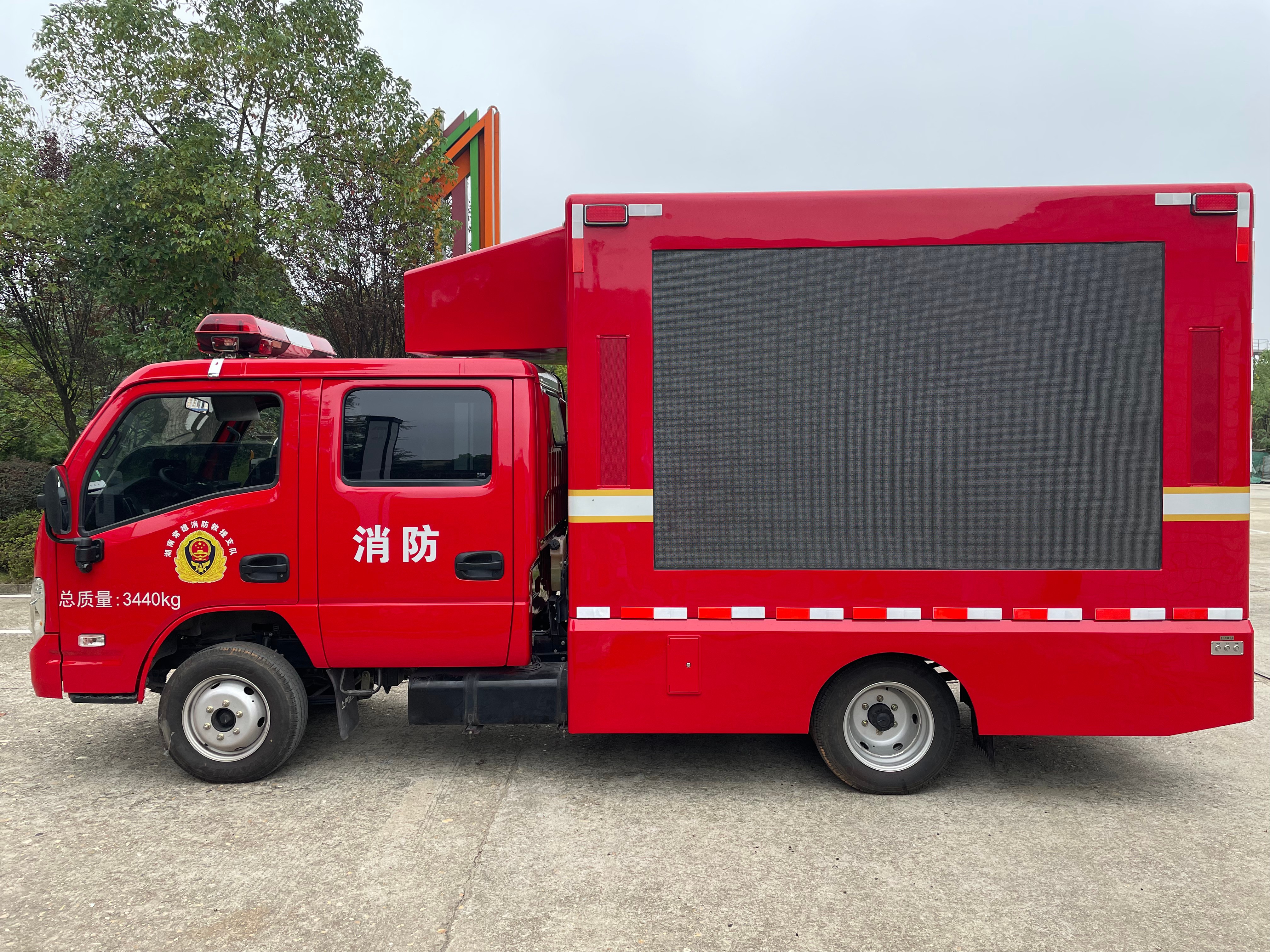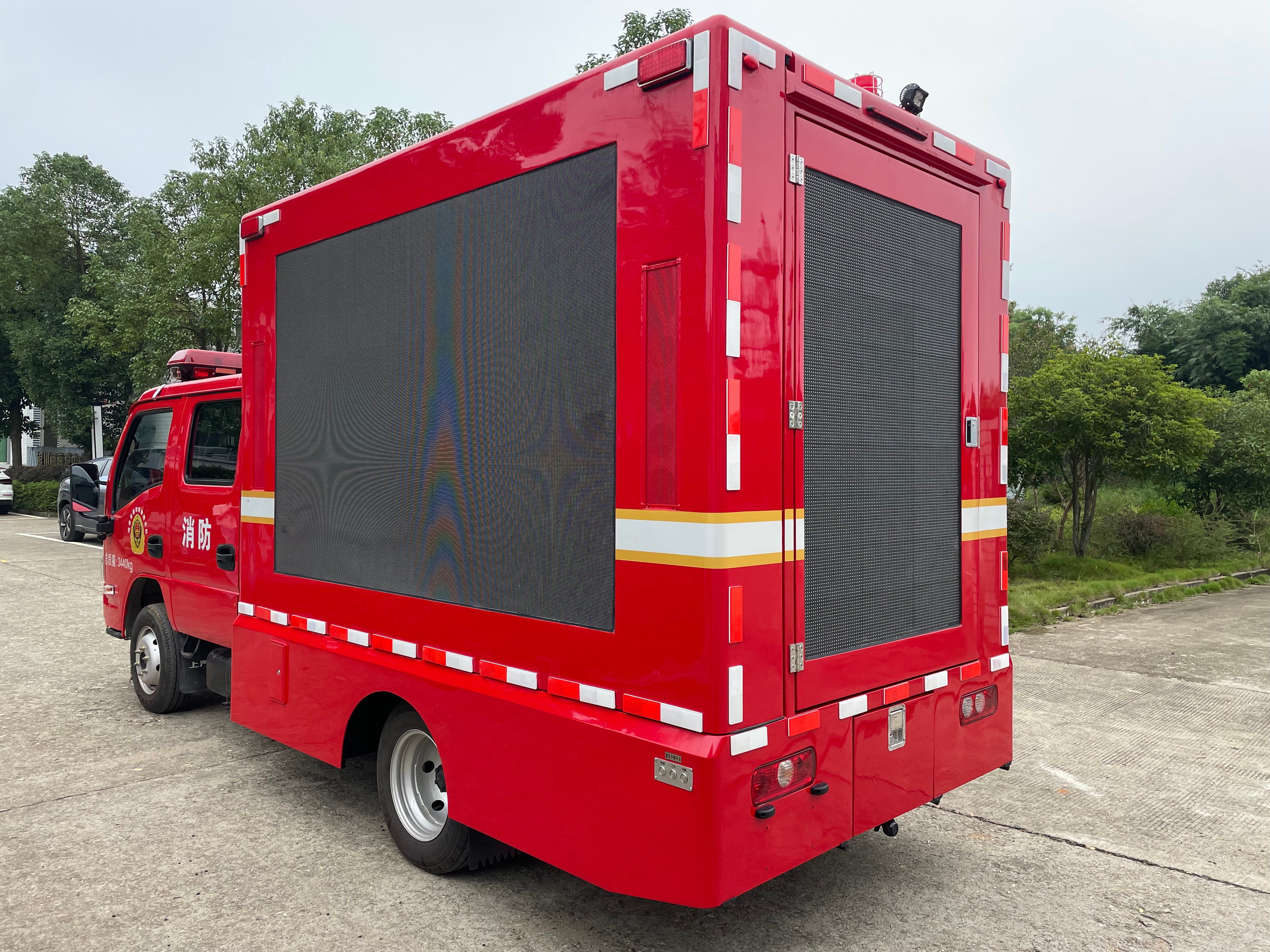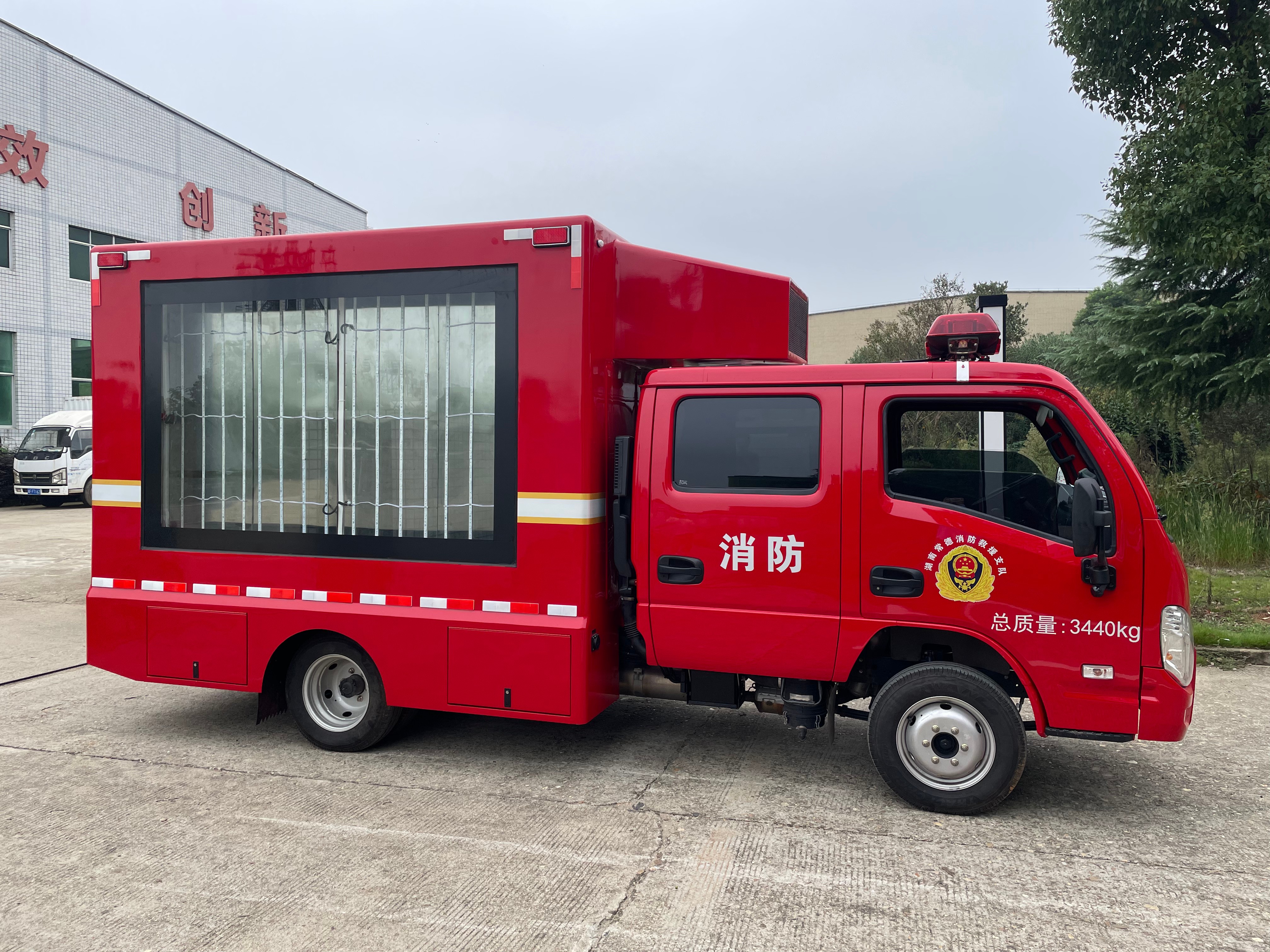 小型消防宣传车基于上汽大通跃进 S100P 二类载货汽车底盘进行改装,采用2+3座位布局,整车配置有LED 全彩大屏、 LED 单色显示屏、数字滚轴系统、车载音箱、车载发电机及消防宣传车模拟装置,具备静态、动态播放各种火灾案例、灭火逃生与自
