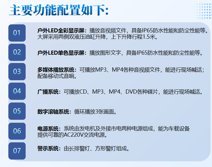 小型消防宣传车基于上汽大通跃进 S100P 二类载货汽车底盘进行改装,采用2+3座位布局,整车配置有LED 全彩大屏、 LED 单色显示屏、数字滚轴系统、车载音箱、车载发电机及消防宣传车模拟装置,具备静态、动态播放各种火灾案例、灭火逃生与自救等音视频的能力,适用于各种狭窄、烂路等复杂路况。